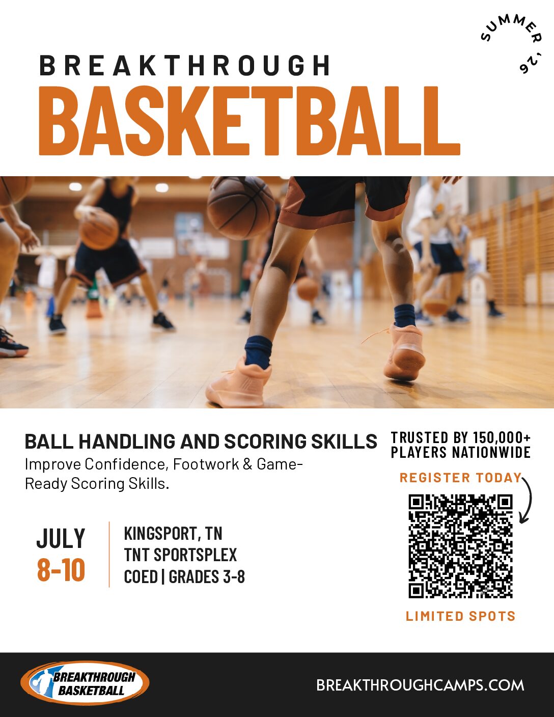 TNT Sportsplex is excited to host the Breakthrough Basketball Ball Handling & Scoring Skills Camp this summer in Kingsport, Tennessee. This three-day camp is designed for boys and girls in grades 3–8 who want to elevate their offensive game and become more confident, skilled players on the court. Led by experienced Breakthrough Basketball coaches, players