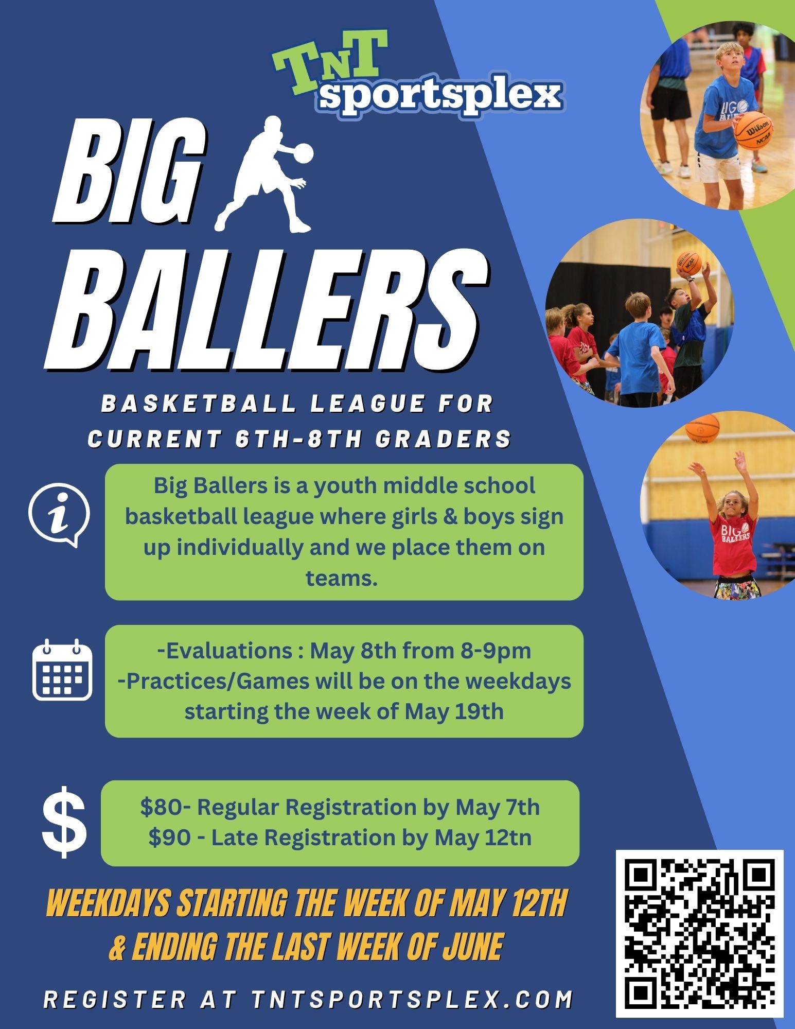Big Ballers Middle School Basketball League The Big Ballers Basketball League at TNT Sportsplex is a competitive and fun youth basketball league for current 6th–8th grade boys and girls. Designed for middle school athletes, the league focuses on skill development, teamwork, and game experience in a structured and positive environment. Players register individually and are