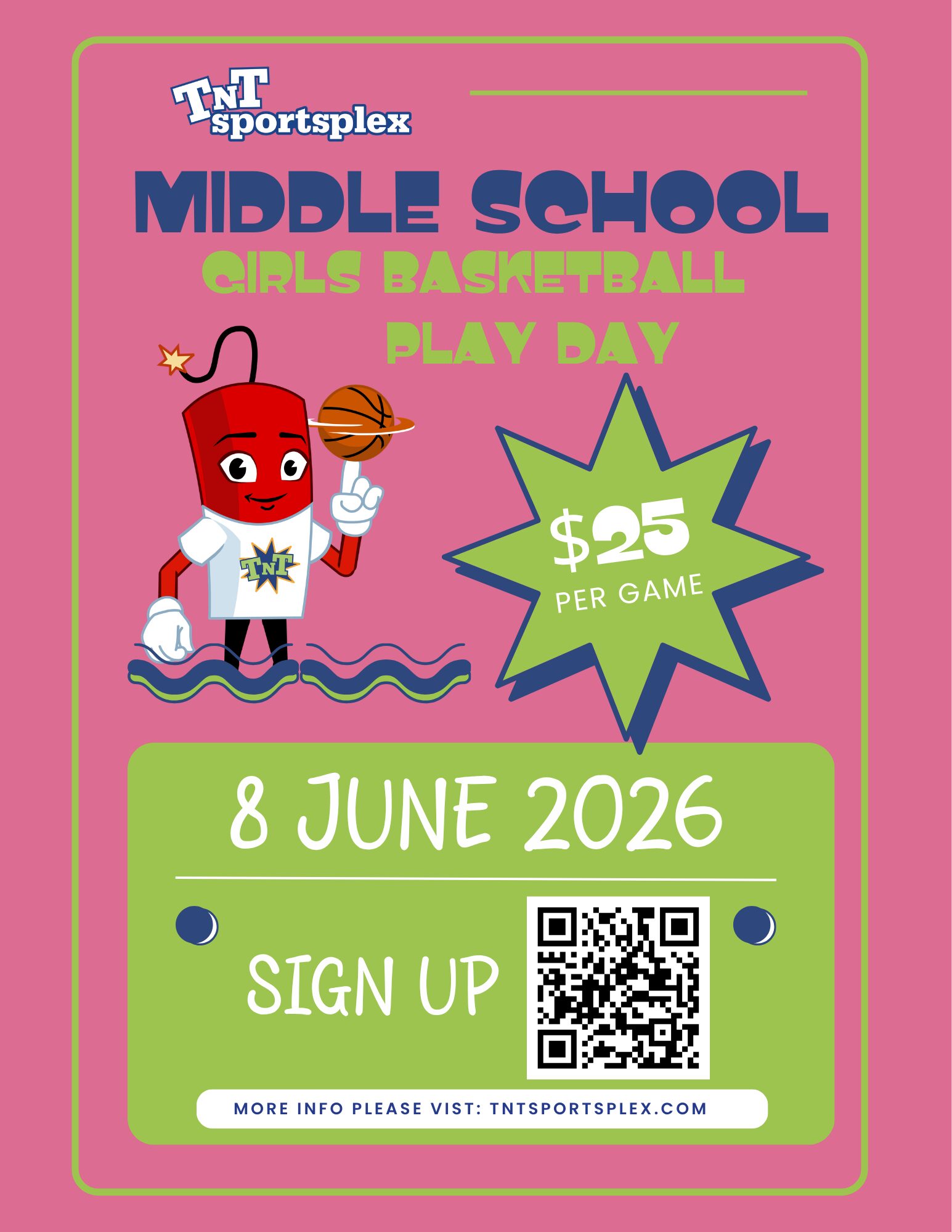 Join us at TNT Sportsplex for our Middle School Girls Basketball Play Day on Monday, June 8th! This one-day event is a great opportunity for teams to get extra game experience, compete in a fun environment, and prepare for upcoming seasons. Teams will face off in a structured play day format, making it perfect for